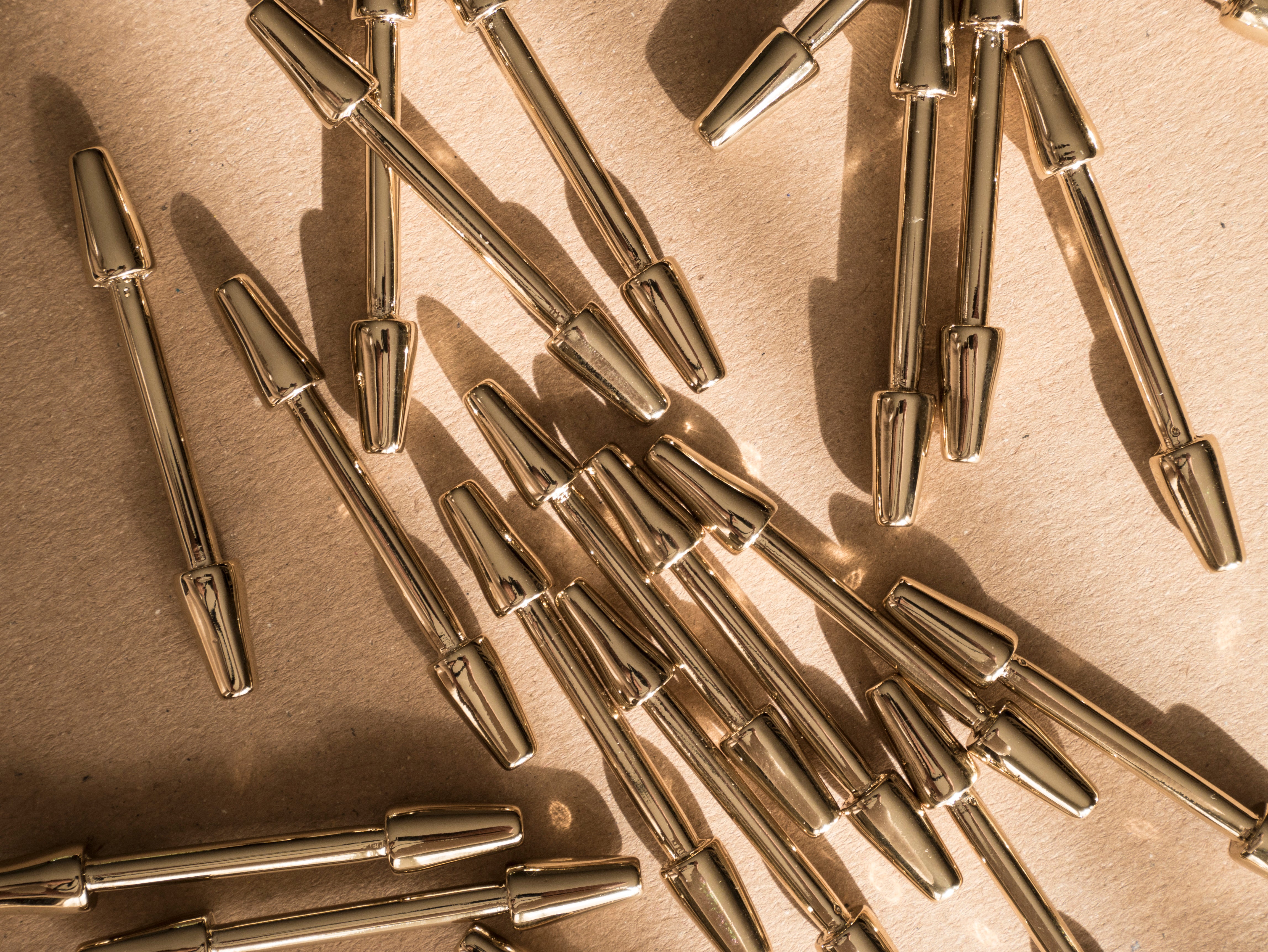 Parées de leurs piercings dorés à l’or fin signature, ses collections intemporelles adoptent des lignes graphiques accentuées, nécessairement urbaines et fonctionnelles, comme le sac «Claude», un trois-en-un adaptable de la bandoulière, à la main, au sac-à-dos et le mini-sac «Léon» avec sa chaine dorée amovible qui se transforme en pochette, portée à la taille, à l’épaule ou autour du buste.